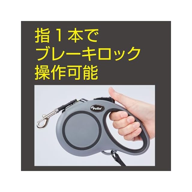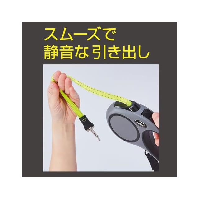スムーズで使いやすい伸縮リード。様々な時間、場所でも視認性の高い蛍光色反射テープでいつでも安心。指一本でブレーキロック操作が可能。サイズ調節可能なストラップ付。