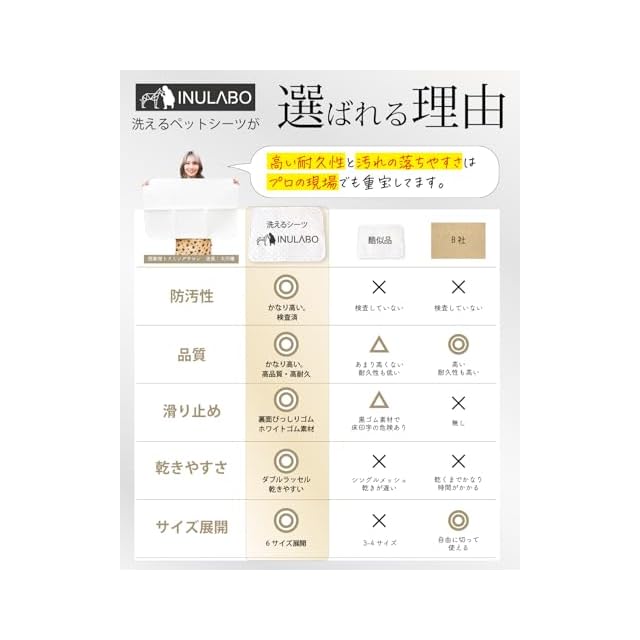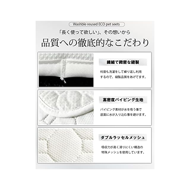 【いつまでも新品のように】 日本企業が品質管理を行っており、メッシュ素材や縫製には非常に強いこだわりを持ち、高品質に仕上げることで、長い間使って欲しいという想いを込めて生産されています。イヌラボの洗えるシーツに使用されているメッシュは「ダブルラッセル」構造を採用。生地にはポリエステルを使用しています。吸収が速い上に、乾燥も早いのが特徴です。何百回と洗濯をしてもヘタレない、抜群の吸収力と速乾性を兼ね備えたシーツに仕上がっています。