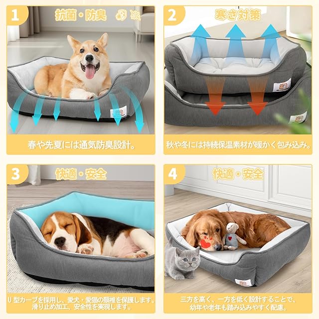 四季 & ペットベッド:モフモフボア材で、中綿は優質なPP立体綿を採用し、弾力性が高く、クッション性も良い。もこもこなので、冬寒さ対策として大人気。愛犬がぐっすり眠れます。