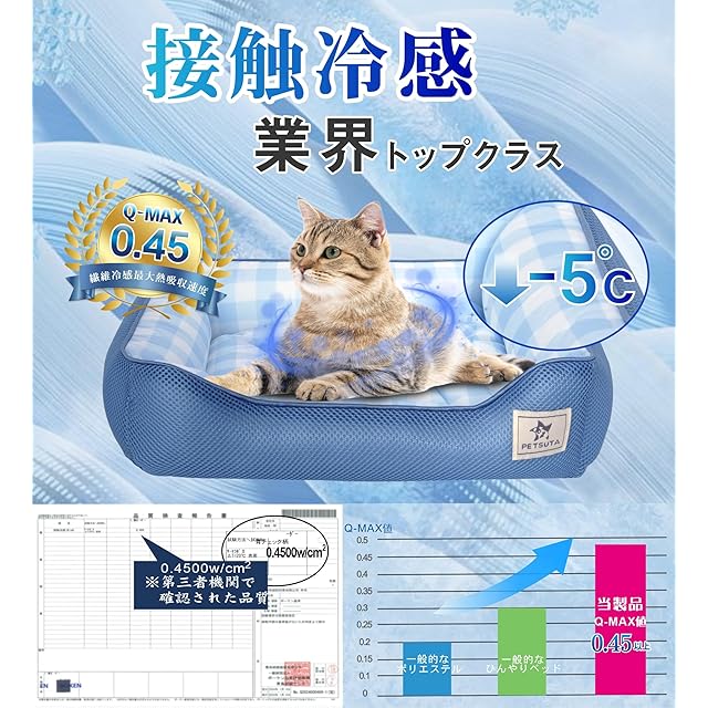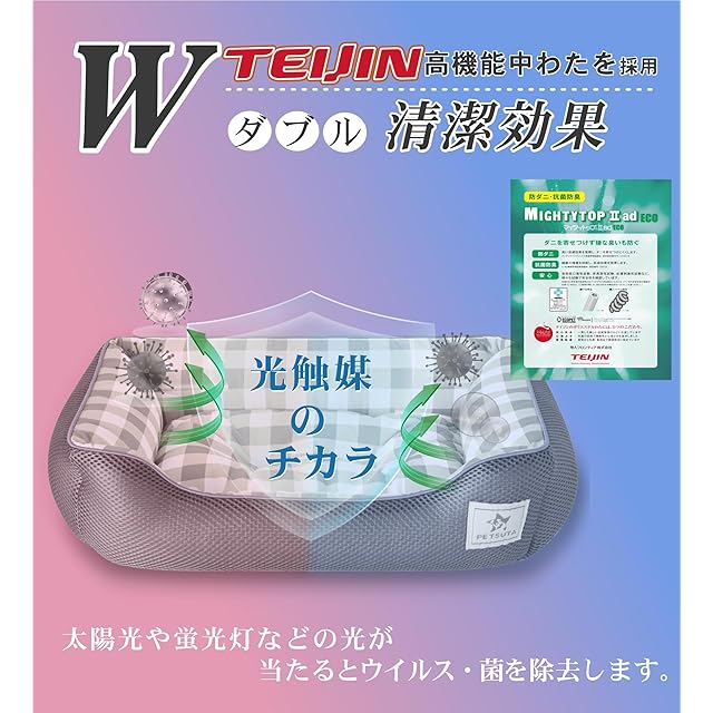 【ひんやり・光触媒抗菌防臭・防ダニ】愛犬や愛猫の熱中症及びクーラー病防止のために表地は接触冷感Q-max値0.45のひんやり生地です。また、ひんやり感だけでなく光触媒加工も施しており、萤光灯など微弱な室内光により長期間の持続抗菌防臭・防ダニ効果を発揮して清潔環境も整えました。蒸し暑い夏でも愛犬や愛猫が清潔で快適な環境で気持ちよくぐっすりと眠れます。