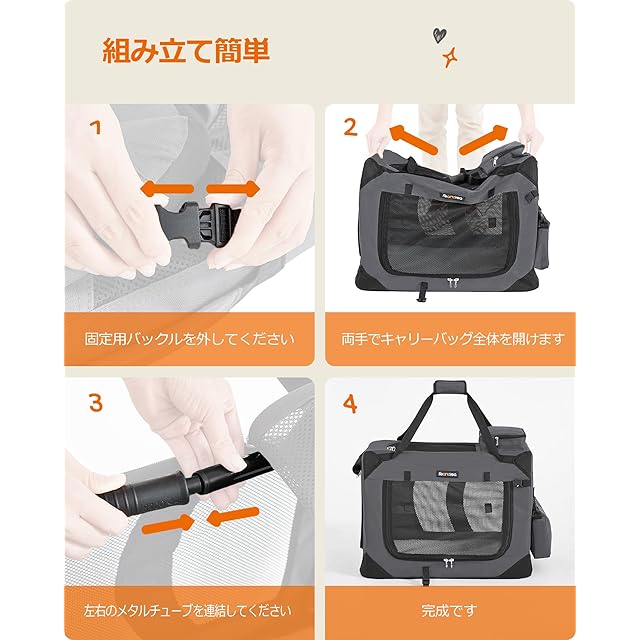 【変形しないデザイン】内部左右に高品質なメタルパイプがデザインされ、連接するとペットキャリー全体のカタチを整い、ペットの可動範囲をしっかり確保します。組立説明書は図解でわかりやすく解説します。