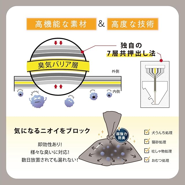 【ニオイ対策】7層の素材に特殊な脱臭フィルムが付加されています。無臭と感じる臭気濃度まで防臭できて、周囲の人をニオイで不快にさせる心配がないのでお勧めです。