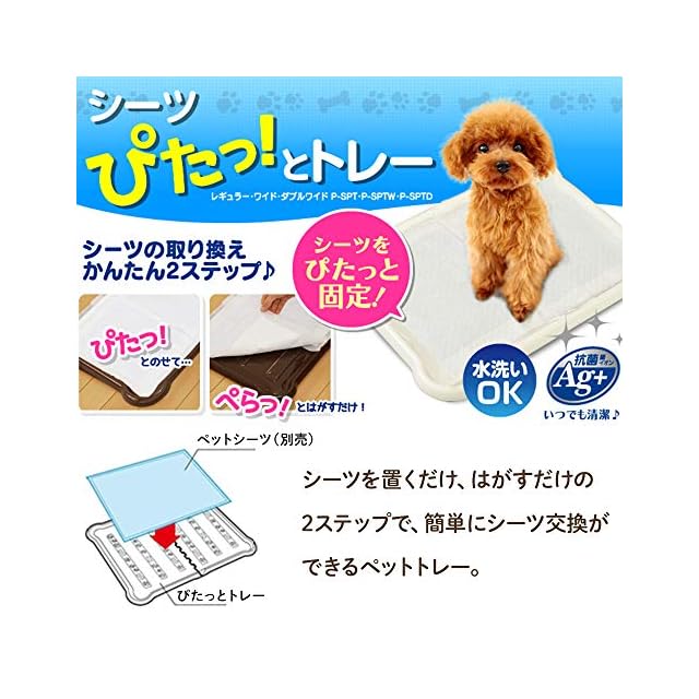 【商品説明】:シーツを置くだけ、はがすだけの2ステップで、簡単にシーツ交換ができるペットトレーです。 トレーについている粘着材がシーツをしっかり固定するので、従来の上枠が不要になりました。 水洗いが可能なので、ごみが付いても洗って繰り返し使えます。 ワイド・ダブルワイドサイズは半分に折って壁ありトイレとしても使用できます。 トレーの中央部分にも粘着材があり、シーツを固定できるため、経済的なハーフシーツの複数使いにも最適です。 ●商品サイズ(cm) ワイド:幅約48×奥行約63×高さ約2.65 ●適合シーツサイズ ワイド/ワイドサイズ:1枚、レギュラーサイズ:2枚、ハーフサイズ:4枚 ●材質 本体:ポリプロピレン ゴム足:エラストマー 粘着材:熱可塑性エラストマー ●重量 ワイド:967g