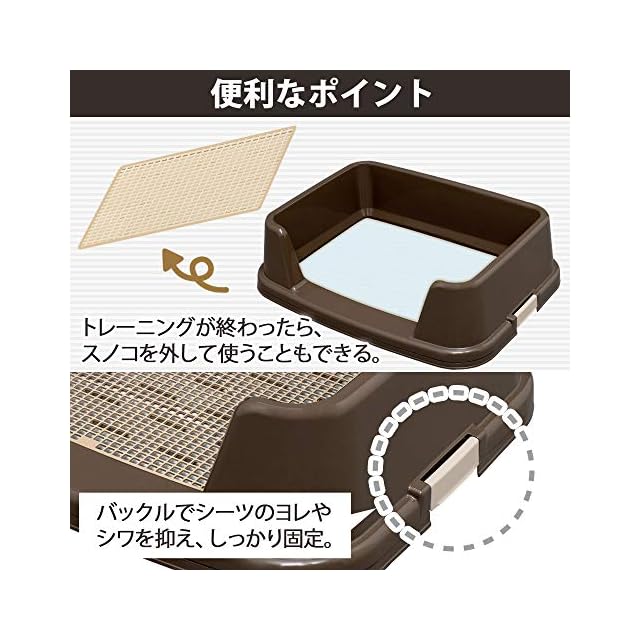 【商品説明】:かわいいマカロンカラーで新登場。トイレトレーニングに最適な犬トイレです。シーツの上にスノコを取り付けて使用することで、犬がシーツをひっかいて破いたり、食べたりすることを防止します。通常の犬トイレに比べて壁やフチが高いので、愛犬がトイレを覚えやすく、おしっこの飛び散り防止にも効果的です。トイレトレーニングが終わればスノコを取り外して通常のトイレとして使用することができます。シーツのヨレやシワを抑えるバックルが付きです。銀イオンで臭いの元となる菌の発生を抑制します。 ●適合シーツサイズ: ワイドサイズ(44×59cm)