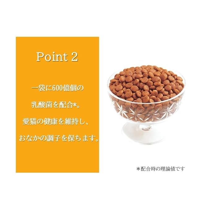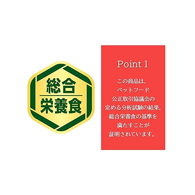 原材料:穀類(とうもろこし、小麦粉、パン粉等)、魚介類(フィッシュミール、フィッシュエキス、フィッシュパウダー、まぐろ節パウダー、しらすパウダー、ほたてエキスパウダー)、ミートミール、動物性油脂、豆類(脱脂大豆等)、ビール酵母、タンパク加水分解物、酵母細胞壁、殺菌乳酸菌、植物発酵抽出物、ミネラル類(カルシウム、リン、カリウム、鉄、亜鉛、銅、ヨウ素)、ビタミン類(A、D、E、K、B1、B2、B6、葉酸、コリン)、アミノ酸類(メチオニン、タウリン)、pH調整剤