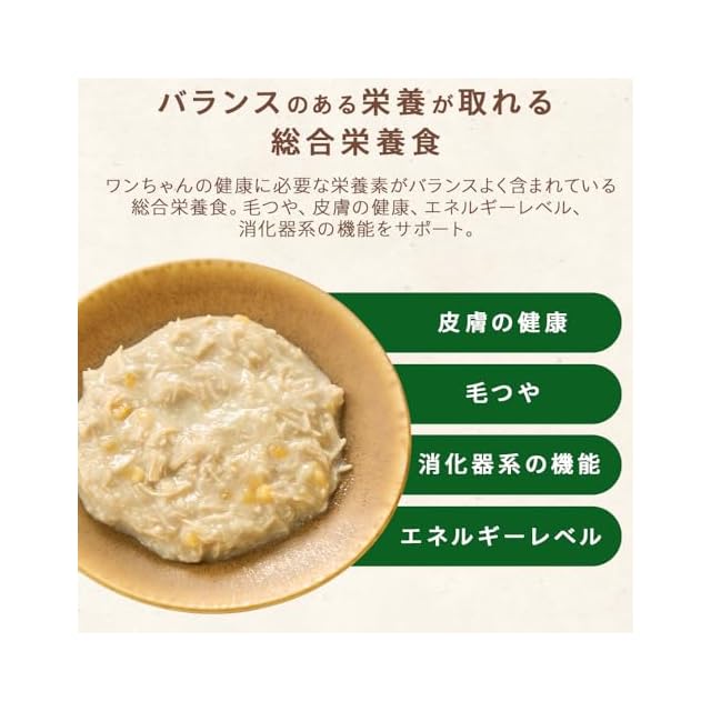 ワンちゃんの健康に必要な栄養素がバランスよく含まれている総合栄養食。毛艶、皮膚の健康、エネルギーレベル、消化器系の機能をサポート。