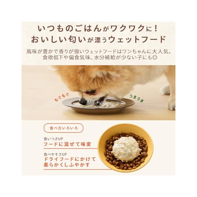 いつものごはんがワクワクに!おいしい匂いが漂うウェットフード。風味が豊かで香りが強いウェットフードはワンちゃんに大人気。食欲低下や偏食気味、水分補給が少ない子にも◎