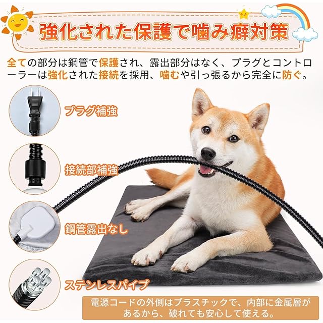 【噛み癖対策 &感電など多重保護 】全ての部分は鋼管で保護され、露出部分はなく、噛むや引っ張るから完全に防ぐ。接続部補強➕コントロラー補強➕全身鋼管保護で露出なし➕プラスチックなラセン管➕高品質電源コードで5重保護で全方位でペットの安全を守る。噛み癖と感電の危険が一切の心配がなし。