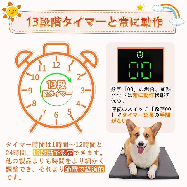【14段階:1~12時間タイマー➕ 24時間タイマー➕ 常に動作】ご必要に応じて適切な時間(1/2/3...12H)を1時間単位で12段階で設定することができます。このペット用ホットカーペットには新たに24時間のタイマー機能も搭載しており、24時間後には自動的に電源が切れるため、安心して長時間使用が可能です。これにより、類似製品よりも細かくタイマー設定と幅広い選択肢が可能になります。時間を設定せずに連続使用したい場合は、タイマーを「00」に設定すれば常に動作になります。設定した時間に達した後、再びオンにするのを忘れる心配はありません。寒がりの愛犬や愛猫にぴったりの防寒対策品です。
