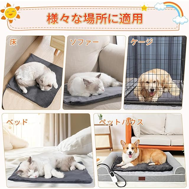 【過熱保護・防水難燃・厚手・省エネ】温度センサーを内蔵し、過熱や漏電などの異常が発生した場合は自動的に電源が切れます、ペットの安全を確保します。ご安心に使用ください。このヒーターは、厚手のスポンジと難燃性のコットンを内部に豊富に使用しており、表面には防水難燃性の人造皮革を採用しています。柔軟性と快適性を確保すると同時に、安全性も確保されています。一時間あたりの消費電力35ワット/電気代0.5円、省エネで長い時間につけっぱなしでも大丈夫です。