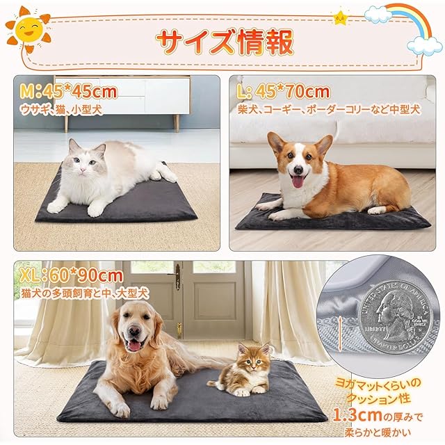 【安心安全ペット用ホット カーペット】この猫犬用ホットカーペットは七重構造のデザインを採用され、温かさを維持できる便利な暖房器具です。真冬の時期でも、ペットの身体を冷やしてしまう心配がありません。サイズ:M(45×45cm) / L(45×70cm)/XL(60×90cm)、サモエド、柴犬、テディ、猫などの大中小型ペット、特に妊娠中や授乳中のペット、または介護が必要あるペットに最適!