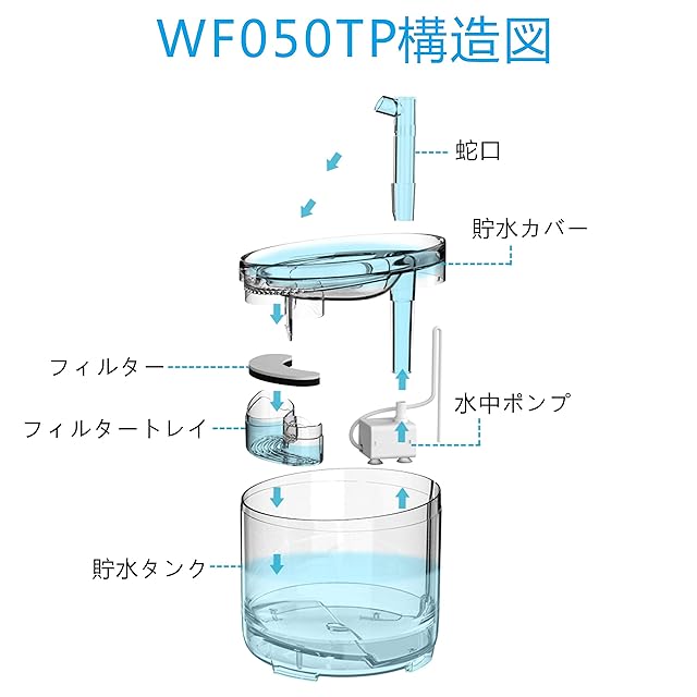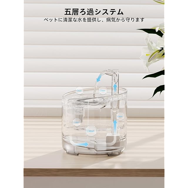 【調整可能な水中ポンプ】:自動給水器 WF050CTLには調整可能な水中ポンプが付属しており、ペットのニーズや好みに応じて水の流量を100%、75%、50%に調整できます。