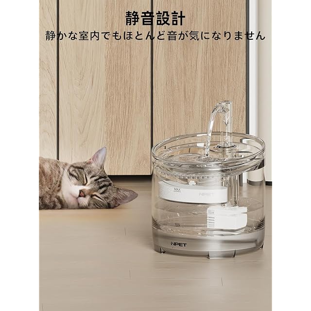 【改良3:目盛り付き】目盛りで水位を簡単に確認できます。透明なデザインにより、タンク内の水量も常に確認可能です。省エネ設計で、消費電力は約2Wです。電気代も抑えられます!