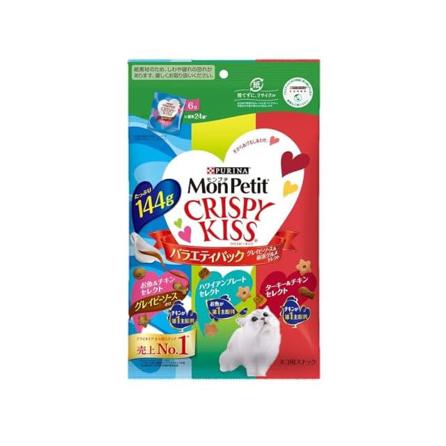 1袋に3つのおいしさ!大人気のグレイビーソースかけフレーバーとお肉もおさかなに楽しめるフレーバー2種でグルメなネコちゃんも満足する大袋バラエティパックに。