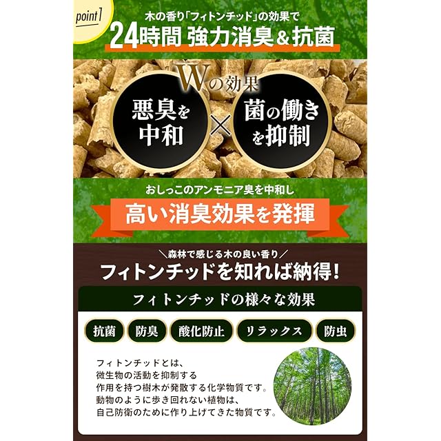 【”超” 強力消臭・抗菌効果】天然木が持つ成分「フィトンチッド」の森林浴効果により、 消臭・抗菌力でおしっこの匂いを抑えていつでも快適です。天然木の香りで家全体を包み込みます!※フィトンチッドとは、 樹木などが発散する化学物質で、殺菌や防腐、空気浄化作用があり、高い消臭効果・脱臭効果があるといわれています。