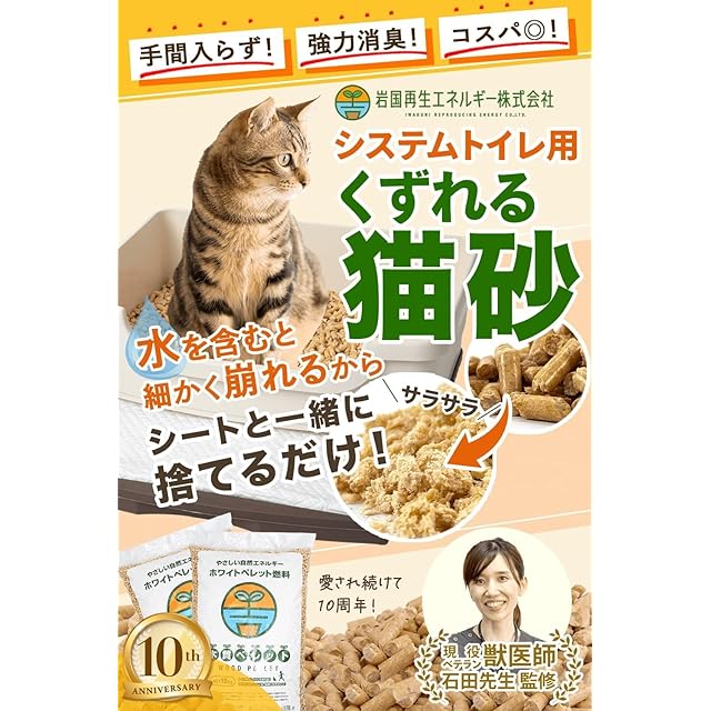 【試しに使ってみてよかったの声多数!】岩国の 崩れる 猫砂 は10周年を迎えるロングセラー商品! 「この猫 砂にして本当に良かった」の声を励みに、 現役の獣医師とともに開発し、 たくさんの猫 ちゃんたちの トイレ 環境・衛生環境を守ってきました!
