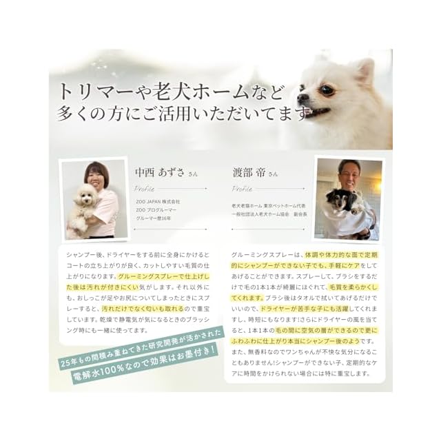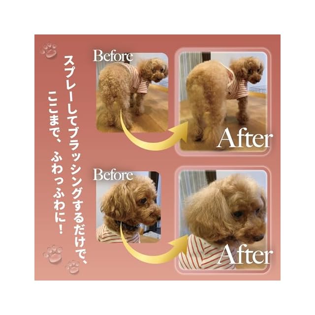 【ブラッシングスプレーとして】ブラッシング時に使うことで、ブラシのとおりを良くしたり、毛玉をほぐすことができます。また静電気防止も期待できます。