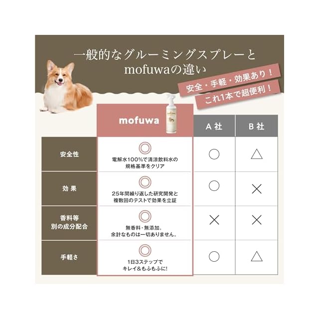 【高い安全性】mofuwaグルーミングスプレーはミネラルウォーターの規格基準をクリアしているため、 万が一舐めてしまっても安心安全!この高い安全性から敏感肌や乾燥肌のペット、赤ちゃんからシニアまでお使いいただけます。