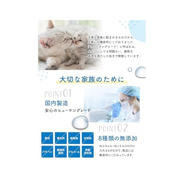 ✅大事な家族に飲ませるものだから、品質には徹底的に拘りました ヒューマングレードと呼ばれる人が口にしても問題ない厳格な基準を満たした処方で開発しております
