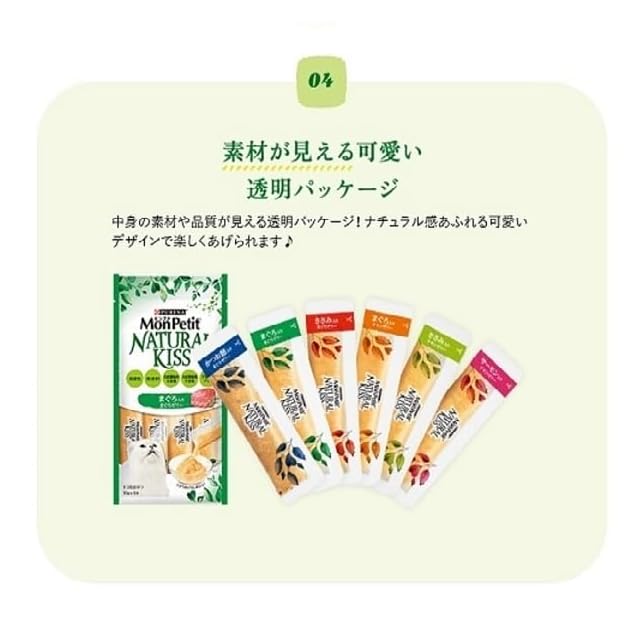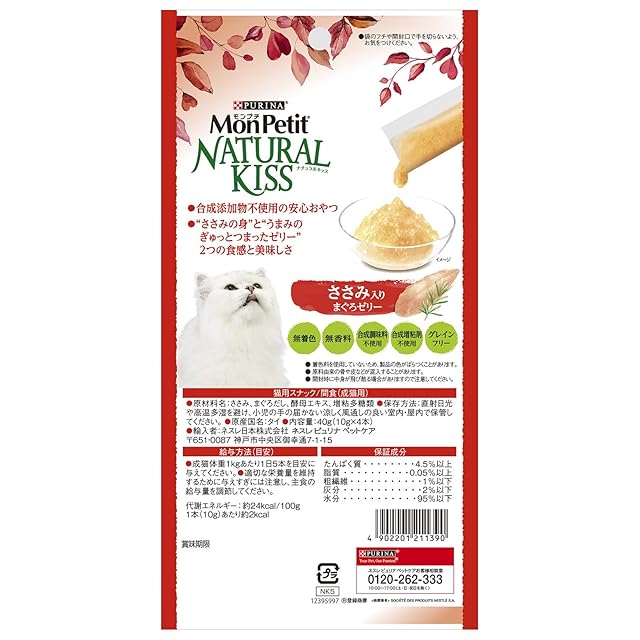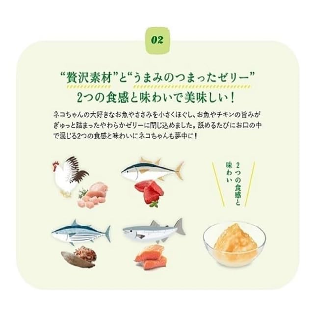 原材料:魚介類(まぐろだし、まぐろ、サーモン)、酵母エキス、チキンパウダー、フィッシュオイル(オメガ3脂肪酸源)、増粘多糖類、ビタミンE(抗酸化成分)