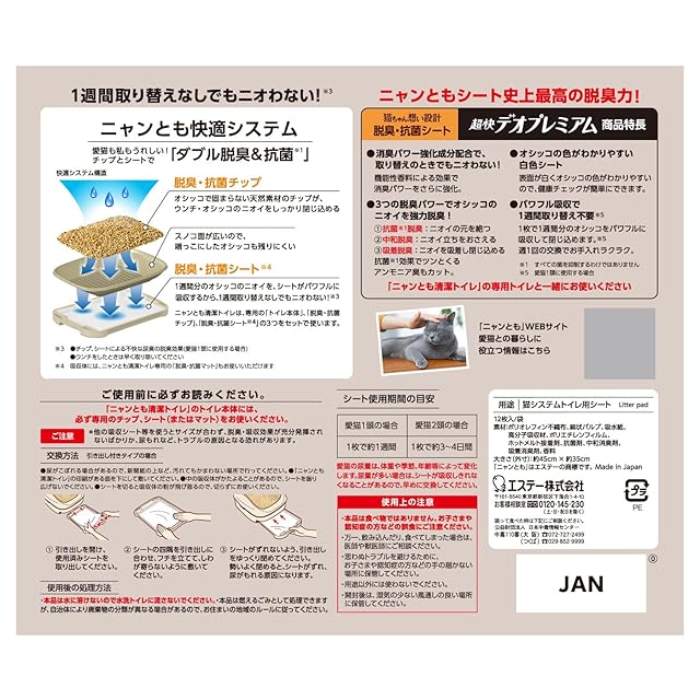 1週間取り替えなしでもニオわない!(※1) ※1●チップ、シートによる不快な尿臭の脱臭効果(愛猫1頭に使用する場合)●ウンチをしたときは早く取り除いてください。