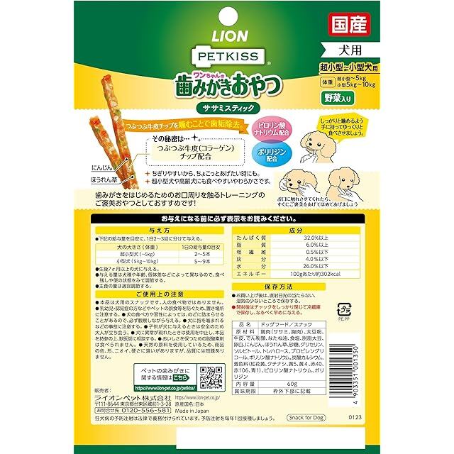 商品名:ライオン PETKISS ワンちゃんの歯みがきおやつ ササミスティック 野菜入り 60g×6個 まとめ買い LIONPET