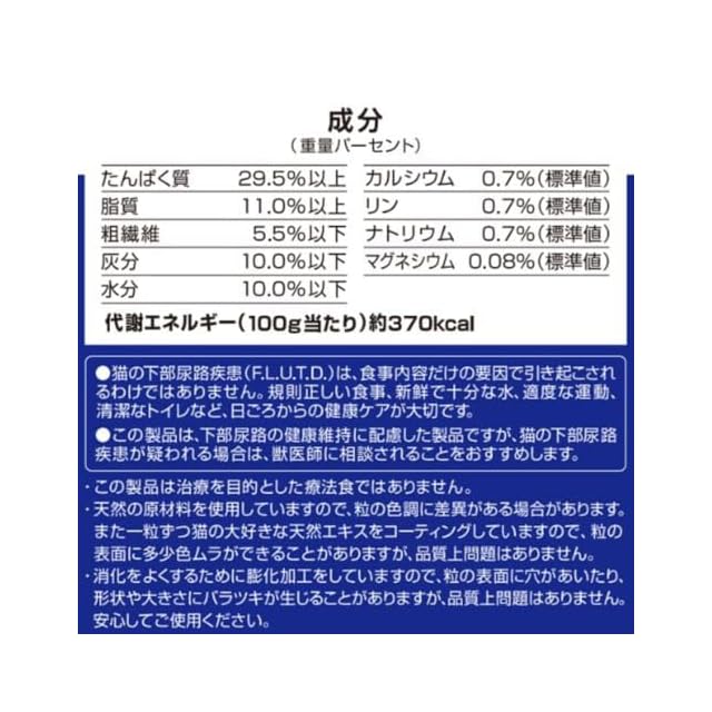 マグネシウム由来とカルシウム由来の尿石に配慮。おなかの善玉菌の乳酸菌を増やすフラクトオリゴ糖配合。<br> ・適正な尿pHコントロール<br> ・マグネシウム由来とカルシウム由来の尿石に配慮<br> ・おなかの健康維持に<br> ・皮膚被毛の健康維持に<br> ・健康で美しい猫の瞳のために<br> ・穏やかな健康生活のサポートに<br> <総合栄養食>