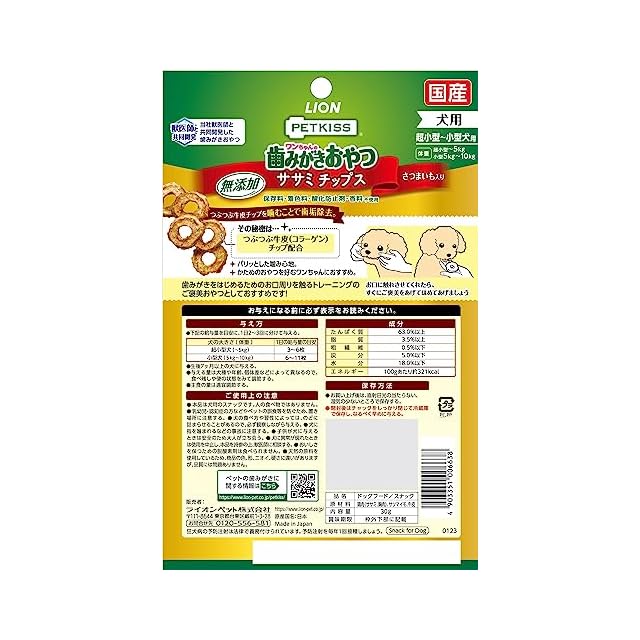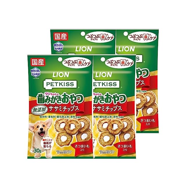 商品名:ライオン PETKISS ワンちゃんの歯みがきおやつ 無添加ササミチップス さつまいも入り 4個パック チキン 無添加さつまいも (まとめ買い)