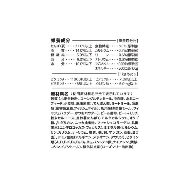 【対象年齢】1歳から【内容量】1.4kg(200g×7分包) カロリー:360kcal/100g 【栄養成分】たんぱく質27.0%以上、脂質14.0%以上、粗繊維5.0%以下、灰分9.0%以下、水分10.0%以下 【サイズ】20×15×30cm