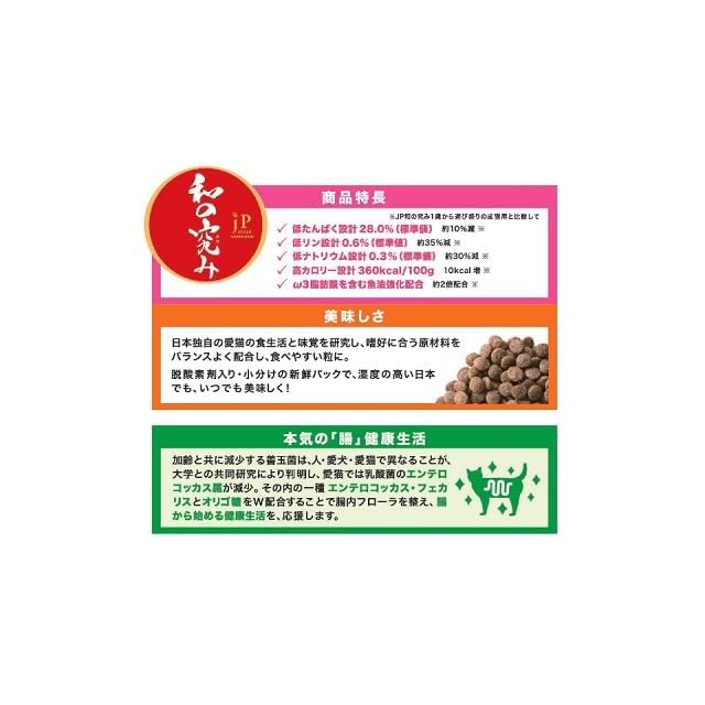 【すべては日本で暮らす愛猫のために】乳酸菌の一種"フェカリス菌"と"オリゴ糖"をW配合し、"腸内フローラ"を整え、健康維持をサポート。「JP 和の究み 1歳から遊び盛りの成猫用」に比べ、リンを約35%減らす等、腎臓の健康維持に配慮したい、少しづつ食べたい愛猫のために栄養設計されました。