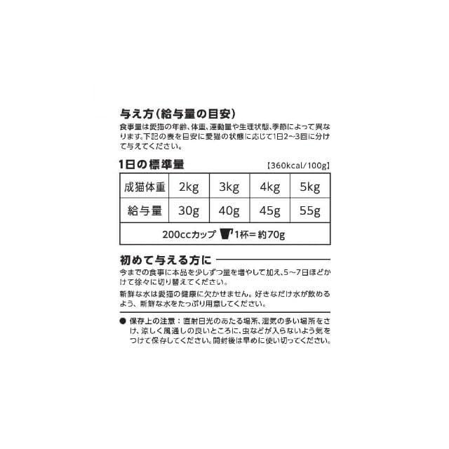 【お召し上がり方】食事量は愛猫の年齢、体重、運動量や生理状態、季節によって異なります。給与量を目安に愛猫の状態に応じて1日2~3回に分けて与えてください。初めてお召し上がりになるねこちゃんには、今までの食事に少しずつ加え、日ごとに量を増やしていき、5~7日ぐらいかけて徐々に切りかえてください。新鮮な水をいつでも飲めるようにしてください。この商品は猫用です。猫以外の動物に与えないでください。
