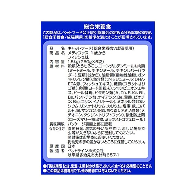 メディファス キャットフード 1歳から フィッシュ味 【下部尿路/pHコントロール/麻布大学共同開発/国産/アルミ小分け】 1.5kg(250g×6)x6(ケース販売)