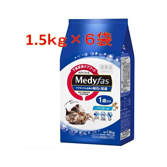 商品名:メディファス キャットフード 1歳から フィッシュ味 【下部尿路/pHコントロール/麻布大学共同開発/国産/アルミ小分け】 1.5kg(250g×6)x6(ケース販売)