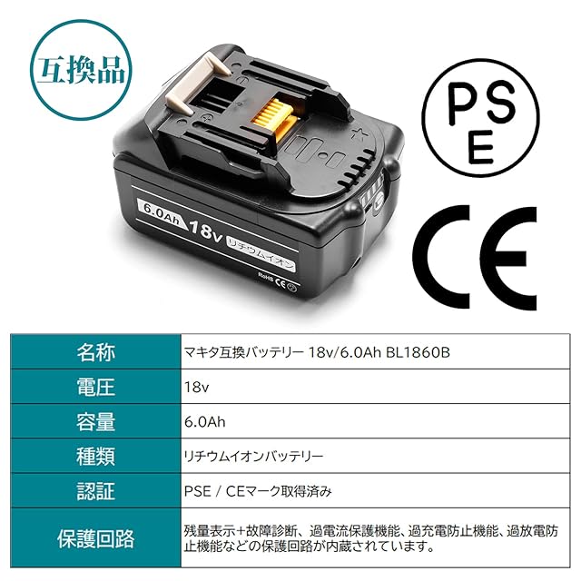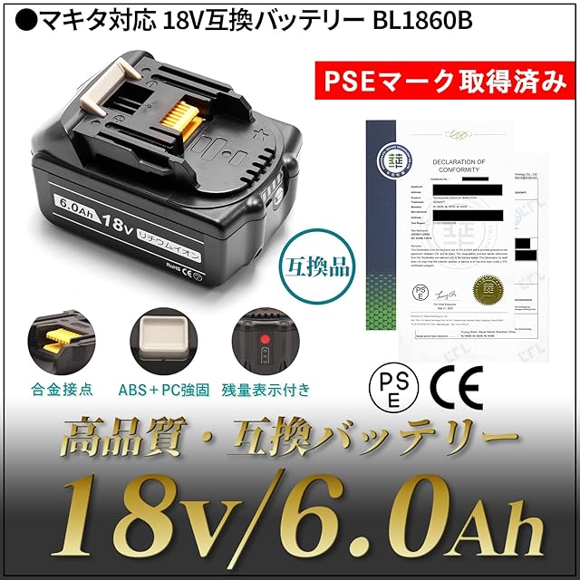 【マキタ18Vバッテリー互換BL1860B】 電圧:18V / 容量:6.0Ah / 種類:リチウムイオン電池高品質採用 多機能付き:バッテリーは残量表示が付いています。 ダブル新機能付き:残量表示 / 認証:PSEマーク CEマーク取得済み 【bl1860b 18v 6.0ah交換可能バッテリー】 BL1815b BL1820b BL1830b BL1840b BL1850b BL1860b BL1870b 194205-3 194230-4 LXT400などに対応できます。急速充電器 DC18RA / DC18RB , DC18RC , DC18RD, DC18SF / DC18SE などに対応できます。