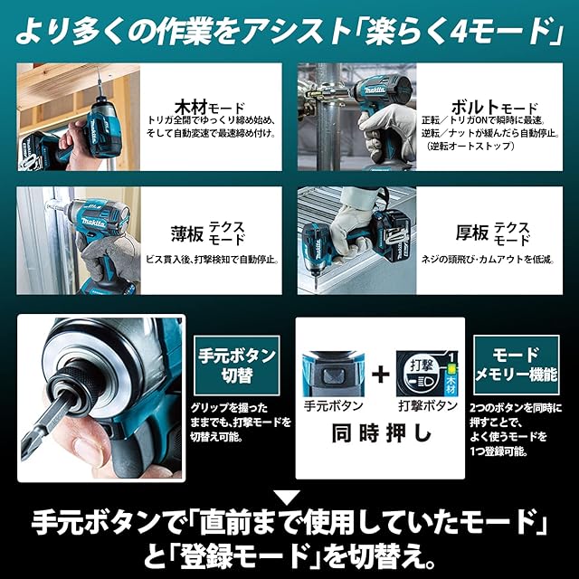 ビット振れ「業界最小」、ダブルボールベアリング採用。 新形状ビットスリーブ。 縁にリブを設け、スリーブが部材に当たっても傷つけにくい。 隅打ち時の傾き「全方位」業界最小 傾き角度約10.5° 優れた隅打ち性能でカムアウトを低減。壁際の作業も快適。 ※ビット長65mm、壁際10mmから離れた位置にあるネジ締め作業時、上方向の最小角度。 締付トルク160N・m以上のインパクトドライバーにおいて。 より多くの作業をアシスト「楽らく4モード」、作業に合わせて、最適なモードを選択可能。
