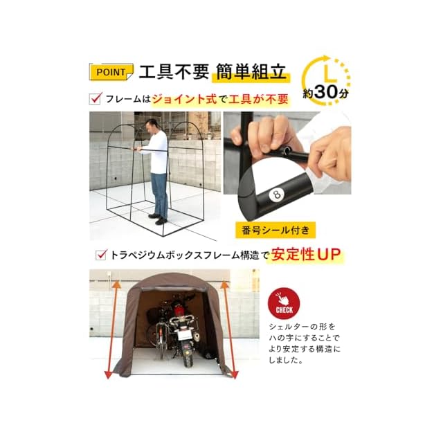 【工具不要の簡単組立て】 当バイクシェルターの組み立てには工具は不要で、フレームは差し込むだけの簡単設計です。フレームには組み立ての順番を示す番号シールが取り付けられていますので、そのシールに従って簡単に組み立てることが出来ます。また日本語の取扱説明書も同梱されていますので、どなたでも簡単に組み立てが可能です。