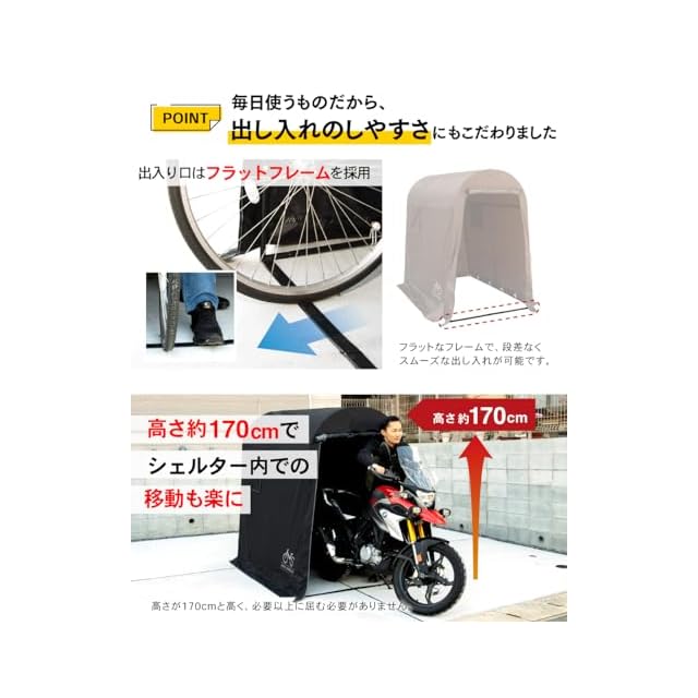 【大人用自転車・バイクを1〜2台(Sサイズ)/2〜3台(Mサイズ)収容可能】 標準サイズの大人用自転車やバイクを1〜2台(Sサイズ)/2〜3台(Mサイズ)収納できるサイズです。大型の物置タイプとは異なり、自宅や庭、ガレージのスペースを効果的に活用することができます。独自の”トラペジウムボックスフレーム設計”の採用により、従来のタイプよりも安定感が向上し、出入り口が広く、愛車のスムーズな出し入れが可能です。高さは170㎝で、一般成人男性の方でもかがむことなく、愛車の出し入れやシェルター内での作業が快適に行える広々としたスペースを提供しています。