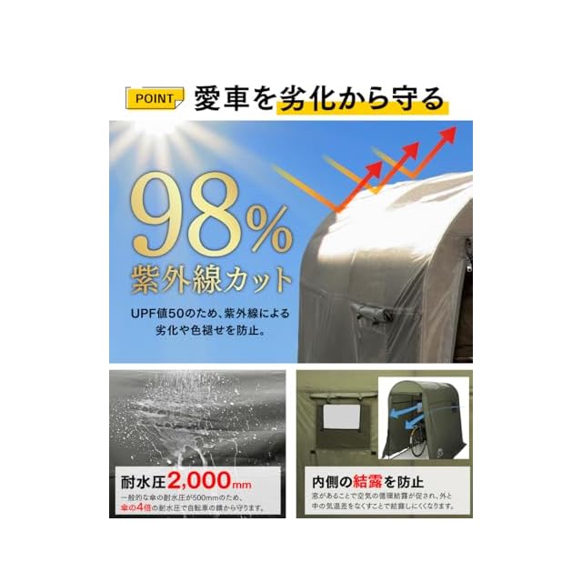 【大切なバイクや自転車を守るリーズナブルなシェルター】 PYKES PEAK( パイクスピーク )より、あなたの大切なバイクや自転車を雨風、日差し、埃から守り、快適な収納を実現します。幕の生地には、高機能ポリエステル生地を採用しています。 本体生地には、キャンプテントなどにも使用される抜群の撥水性と耐久性を兼ね備えた高機能ポリエステル生地を採用しています。シート裏面にPUコーティング加工された高耐水加工生地は、最大2,000mmの耐水圧を誇ります。シートの縫い目部にはシームテープ加工を施し、雨や水滴の侵入を軽減します。さらに、UV加工が施された生地は、UPF値50の高いUV防止効果を発揮し、大切な愛車を雨や湿気、太陽光からの紫外線などから保護し、愛車の劣化や色あせを最小限に抑えます。