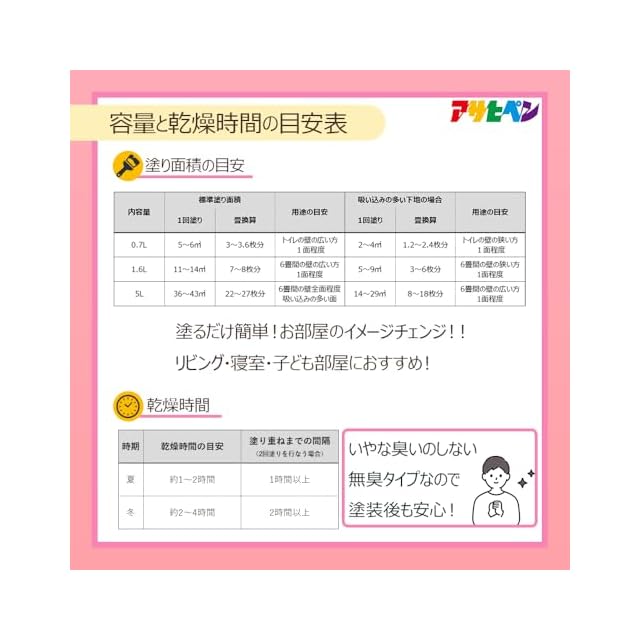 (標準)塗り面積:1.6L/【1回塗り】11~14㎡ (タタミ7~8枚分)【吸い込みが激しい面】5~9㎡(タタミ3~6枚分)