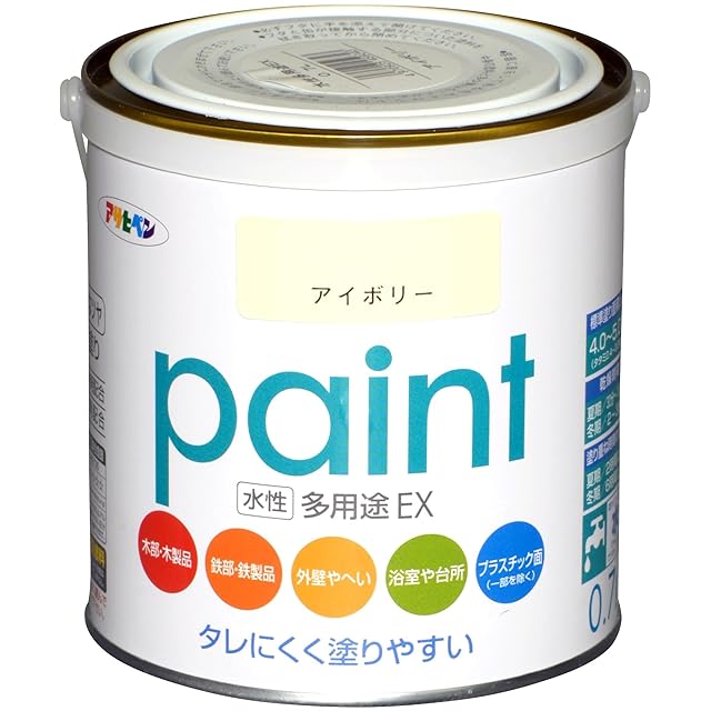 用途:(屋内外区分:屋内外用)ドア、雨戸、羽目板、板べい・ガーデン用品など屋内外の木部や家具・木工品などの木製品。浴室・居間・台所などのしっくい・モルタル・コンクリート壁・板壁。コンクリート・ブロック・スレート・各種サイディングなどの外壁やへい。フェンス・門扉・鉄柵・看板・おもちゃなどの鉄部・鉄製品。発泡スチロール・アクリル・硬質塩ビなどのプラスチック面。