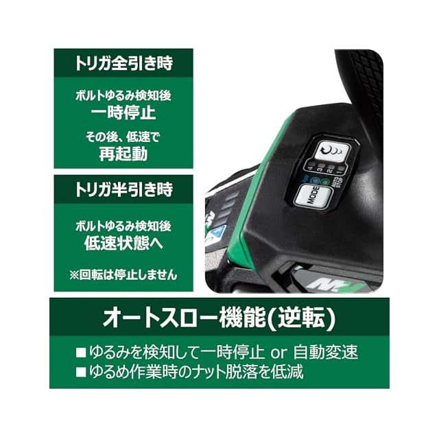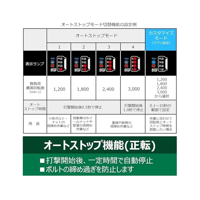 あらかじめ設定された時間・回転速度に自動で停止・変速し、ナットの脱落や締めすぎ防止に役立つオートストップ・オートスロー機能搭載。