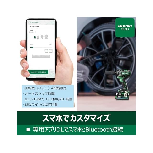 Bluetooh蓄電池使用時、HiKOKI TOOLSアプリとの連動で回転数、オートストップ時間、LEDライトの点灯時間が設定可能