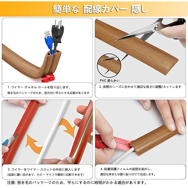 【操作簡単】取り付けが簡単で、フレキシブルに使用できる 、配線隠しカバー バック配線-粘着紙をはがします、配線カバー の素材は柔らかくて、ハサミでカットして自由に長さを調整できます、簡単に設置でき、床や壁を傷つけることなく利用可能です、配線カバー 強力で耐摩耗性、使い勝手が良く、部品も不要で、貼り付けて直接使用でき、乱雑なラインも解消されます