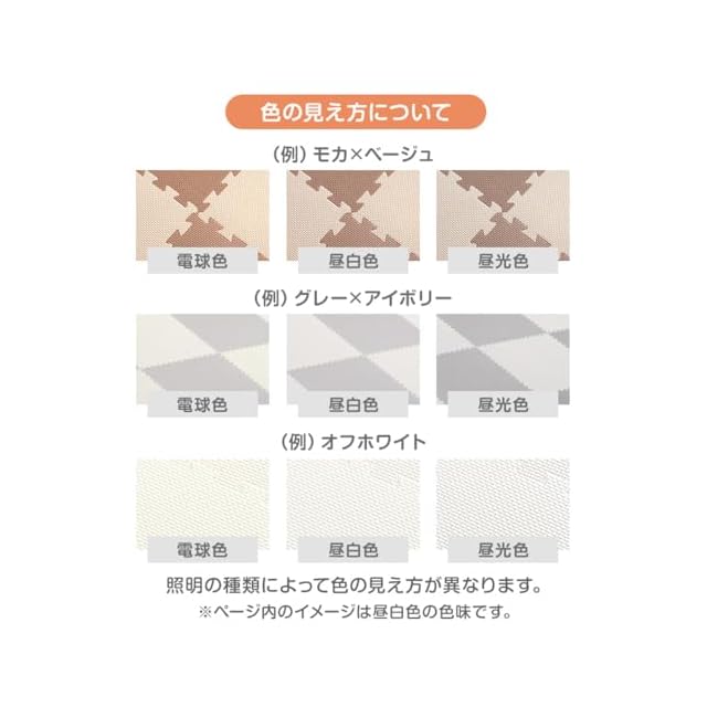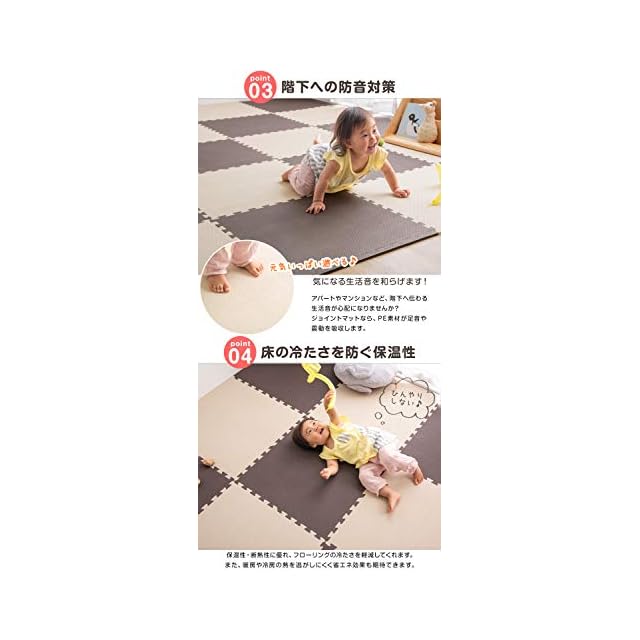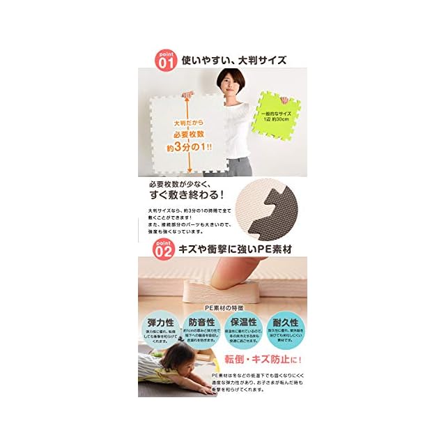 ・表面の凹凸の深さに若干の個体差がある場合がございます。 ・ロットによって色味が異なる場合がございます。 ・床暖房の種類等によって、商品に多少の反りが生じる場合がございます。 ・PE素材の特性上、使用するうちに負荷がかかる部分に多少のへたりが生じます。 そのため、既に使用しているマットに新しいマットを繋げて使用する際、上手く繋がらない場合もございますので、予めご了承ください。 2019年1月10日に素材をEVAからPEに変更しました ※床材(塩化ビニル・フローリング等)によって、色移りや変色が起こる場合がございます。床とマットの間に敷物や防護シートを敷いていただくことを推奨しております。