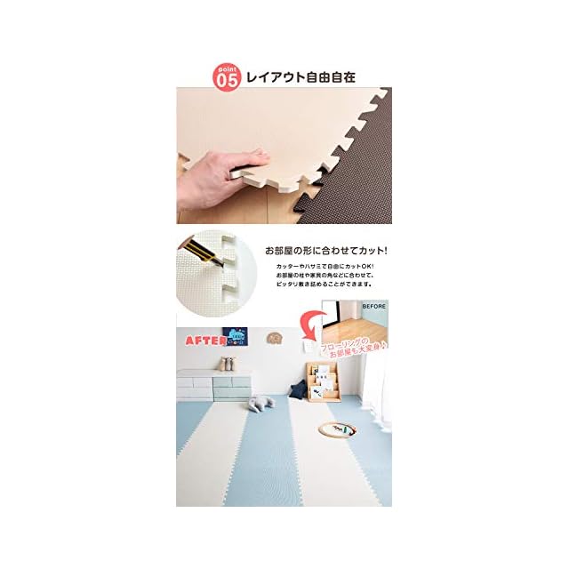 【スタッフのおすすめポイント!】 ・お子さまにも安心のノンホルムアルデヒド ・シックハウス症候群の原因物質7種をしっかり検査 ・抗菌防臭加工 ・床暖房対応 ・設置時間も短縮できる大判サイズ ・サイドパーツ付き ・クッション性が高くキズ,衝撃に強いPE樹脂 ・お子様が元気いっぱい遊べる 防音性能1級獲得 ・床の冷たさを防ぐ保温性 ・カッターやはさみで簡単に切れ,レイアウト自由自在 ・汚れた時はさっと一拭き♪お手入れ簡単