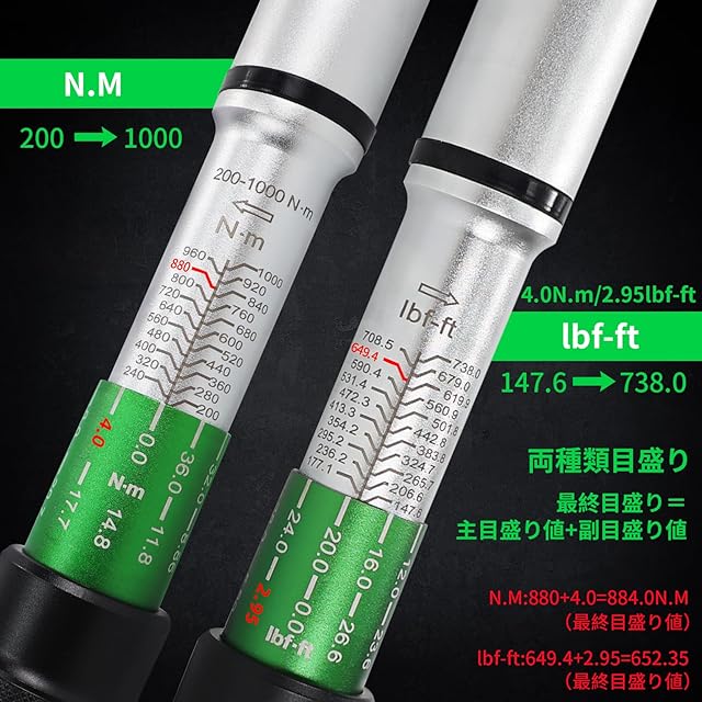 【ダブル目盛り、見みやすいトルクレンチ】このトラック用トルクレンチは2種類単位N.m / lbf-ft表示で選択肢を提供します,視認性も高いので、トルク値を簡単に読みます,炎天下でも見やすいトルクレンチです。読み方:最終目盛り値=主目盛り値+副目盛り値,ちなみに、本商品は毎年または5000回使用した後に検証しなければなりません。