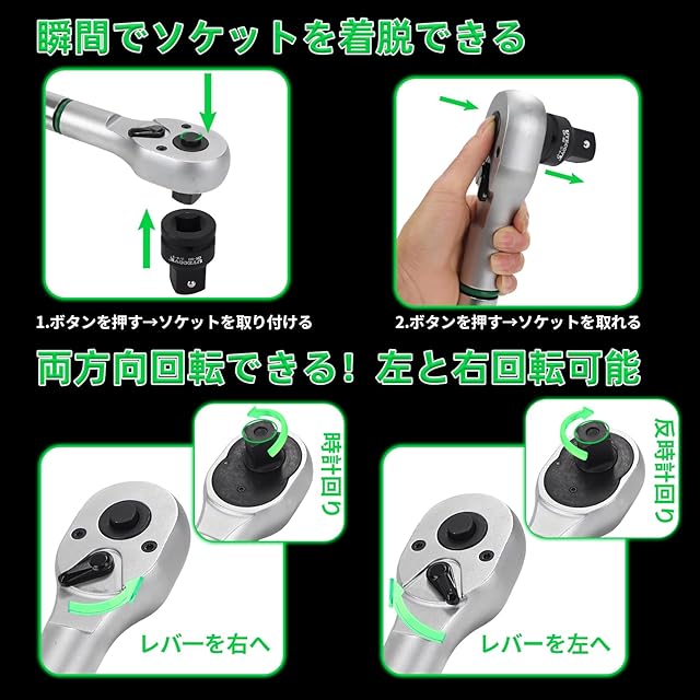 【梱包内容、左右回転、快速着脱】このトルクレンチセットは1インチから3/4インチまで変換アダプター付きなので、実用性があります。大型 自動車用トルクレンチ本体は約183cm、長いトルクレンチですが,本体が回転を通して2部分に分解できます、持ち運びやすい収納ケースもありますので、収納性や携帯性があります,車載工具としても問題がありません,大型車用トルクレンチとして大丈夫です。右回転や左回転も対応できます,両回転トルクレンチです。ボタンを押すと、ソケットを快速に着脱できます