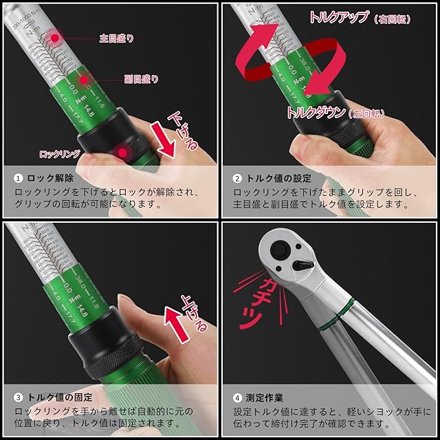 【使いやすい高トルクトルクレンチ、幅広い用途】トルクレンチ本体は回転を通して組み立てが完了後、まずは、ロックリングを下げてロックが解除されます,次は、ロックリングを下げたまま、グリップを回転して主目盛り値と副目盛り値を設定します,それから、ロックリングを手から離せば、自動に元の位置に戻ります,トルク値が固定されます,トルク設定値に達すると軽いショック「カチッ」という音で知らせてくれます。大型トラックや大型車ばかりでなく、産業工場での組立作業,一般産業機器およびプラントのメンテナンス作業にも大活躍です