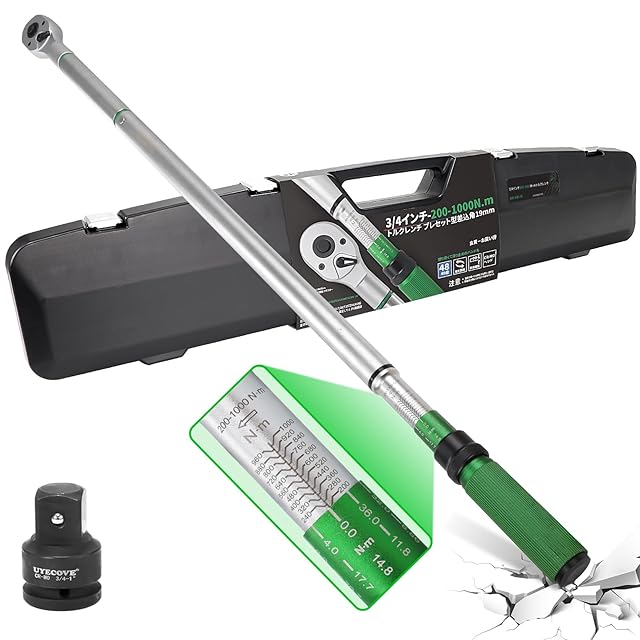 UYECOVE トルクレンチ トラック 大型車 プレセット型 差込角19mm (3/4インチ) 200-1000N.m タイヤ交換 高トルク 長い 機械の整備 作業工具 高精度 ±3% ダブル目盛り 見みやすい 左右回転 48ギア 7.5°送り角 快速着脱 校正証明書 日本語取扱説明書 変換アダプター 収納ケース付き | つむぎ屋