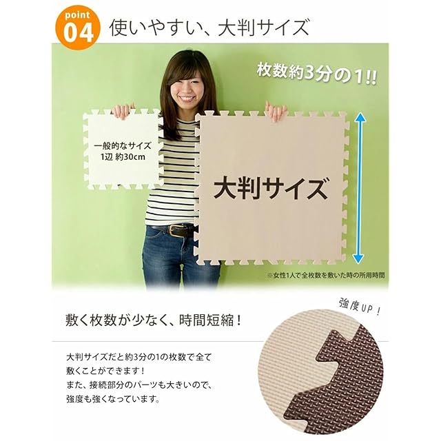 【スタッフのおすすめポイント!】・クッション性、防音性が高い極厚20mm・お子さまにも安心のノンホルムアルデヒド・シックハウス症候群の原因物質7種をしっかり検査・小スペースや買い足しに最適な16枚セット・菌の増殖を抑制する抗菌加工・設置時間も短縮できる大判サイズ・サイドパーツ付き・床暖房対応・キズ・衝撃に強いPE樹脂・床の冷たさを防ぐ保温性・カッターやはさみで簡単に切れるのでレイアウト自由自在・お子様が元気いっぱい遊べる 防音性能1級獲得・汚れた時はさっと一拭き♪お手入れ簡単